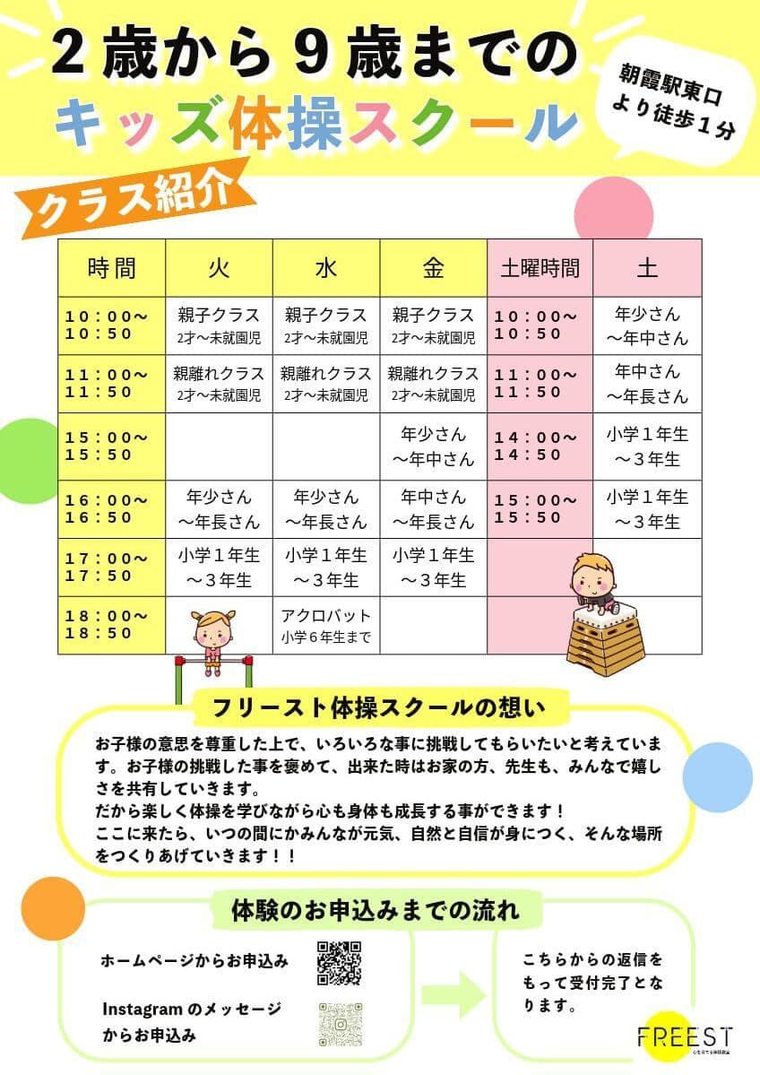 HOME | クラス CLASS 授業の内容 (準備体操)約10分〜20分楽しみながら準備体操をして体を温めていきます。絵柄マットを使って自分の位置を決める ↓(種目別の運動)約30分鉄棒・跳び箱・マット・体幹トレーニング遊び などたくさんチャレンジ!無理矢理やらせることはしません。出来たこともチャレンジしたことも褒めよう!