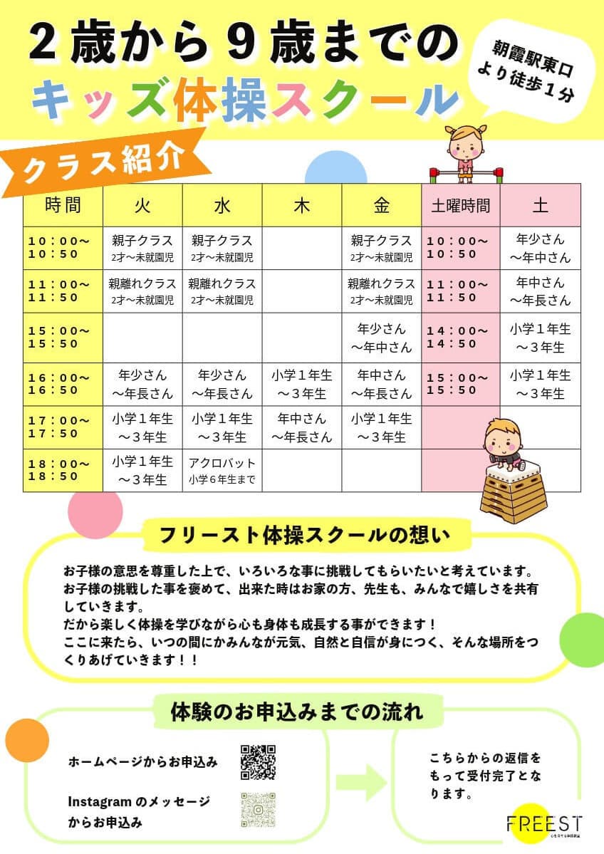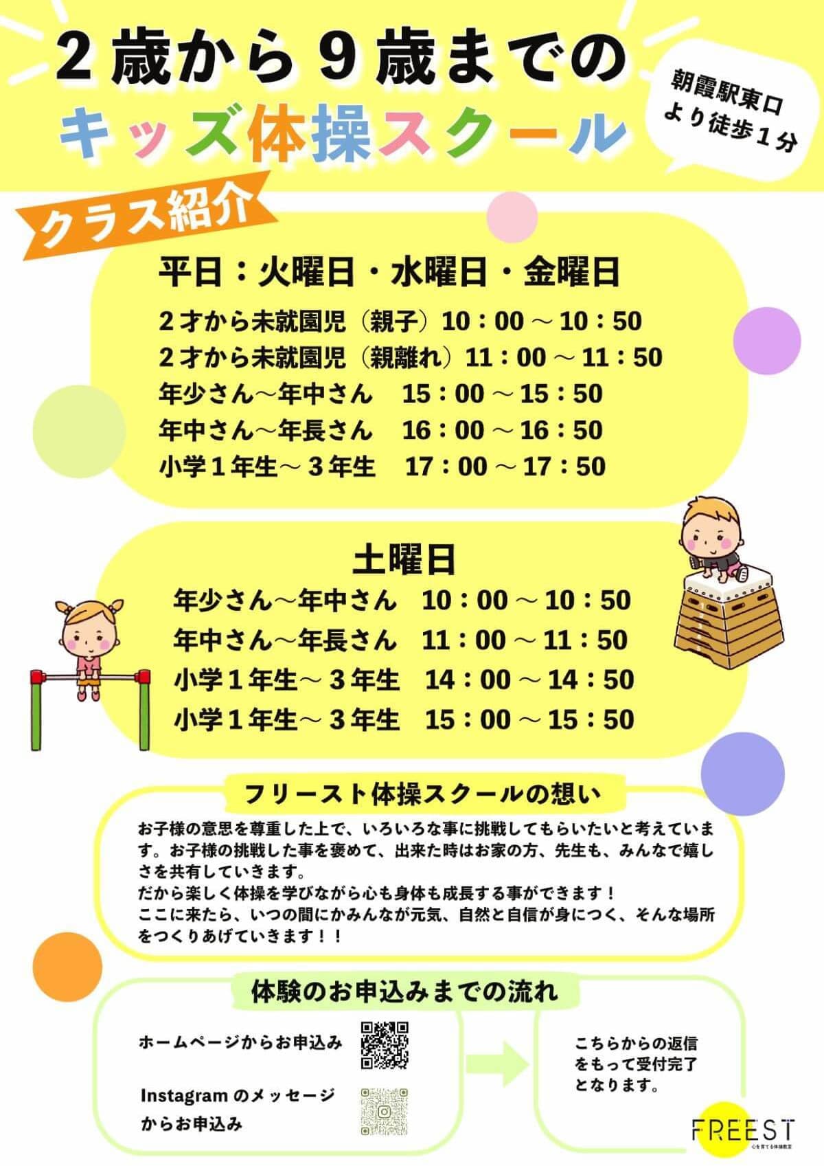 HOME | クラス CLASS 授業の内容 (準備体操)約10分〜20分楽しみながら準備体操をして体を温めていきます。絵柄マットを使って自分の位置を決める ↓(種目別の運動)約30分鉄棒・跳び箱・マット・体幹トレーニング遊び などたくさんチャレンジ!無理矢理やらせることはしません。出来たこともチャレンジしたことも褒めよう!